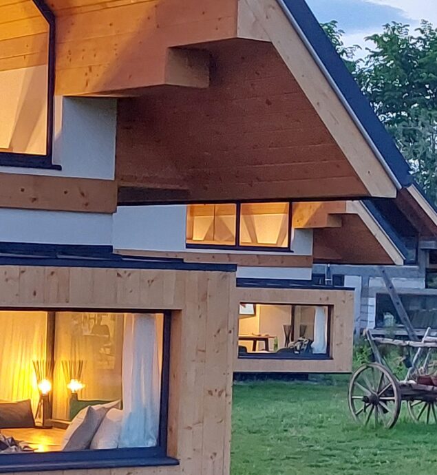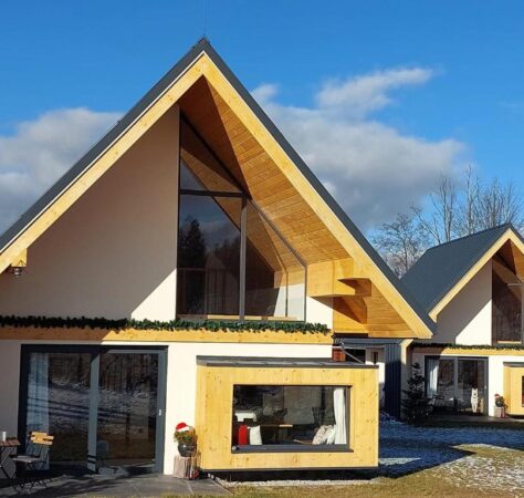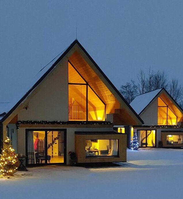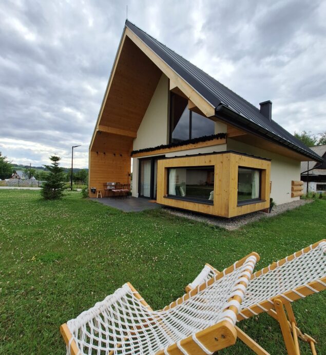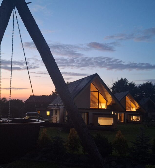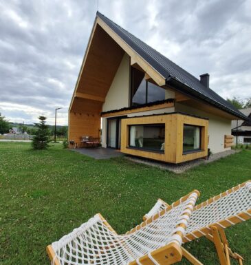 Domki o wysokim standardzie posiadają w pełni wyposażone aneksy kuchenne (zmywarka, płyta indukcyjna, lodówka, naczynia, garnki, mikrofala), łazienki (z dodatkowym wyposażeniem dla OzN) oraz pokoje: sypialnia (z dostępnym łóżkiem regulowanym dla OzN), salon z 2os rozkładaną kanapą oraz antresola na której znajdują się dwa 1os łóżka oraz jest możliwość dostawki.